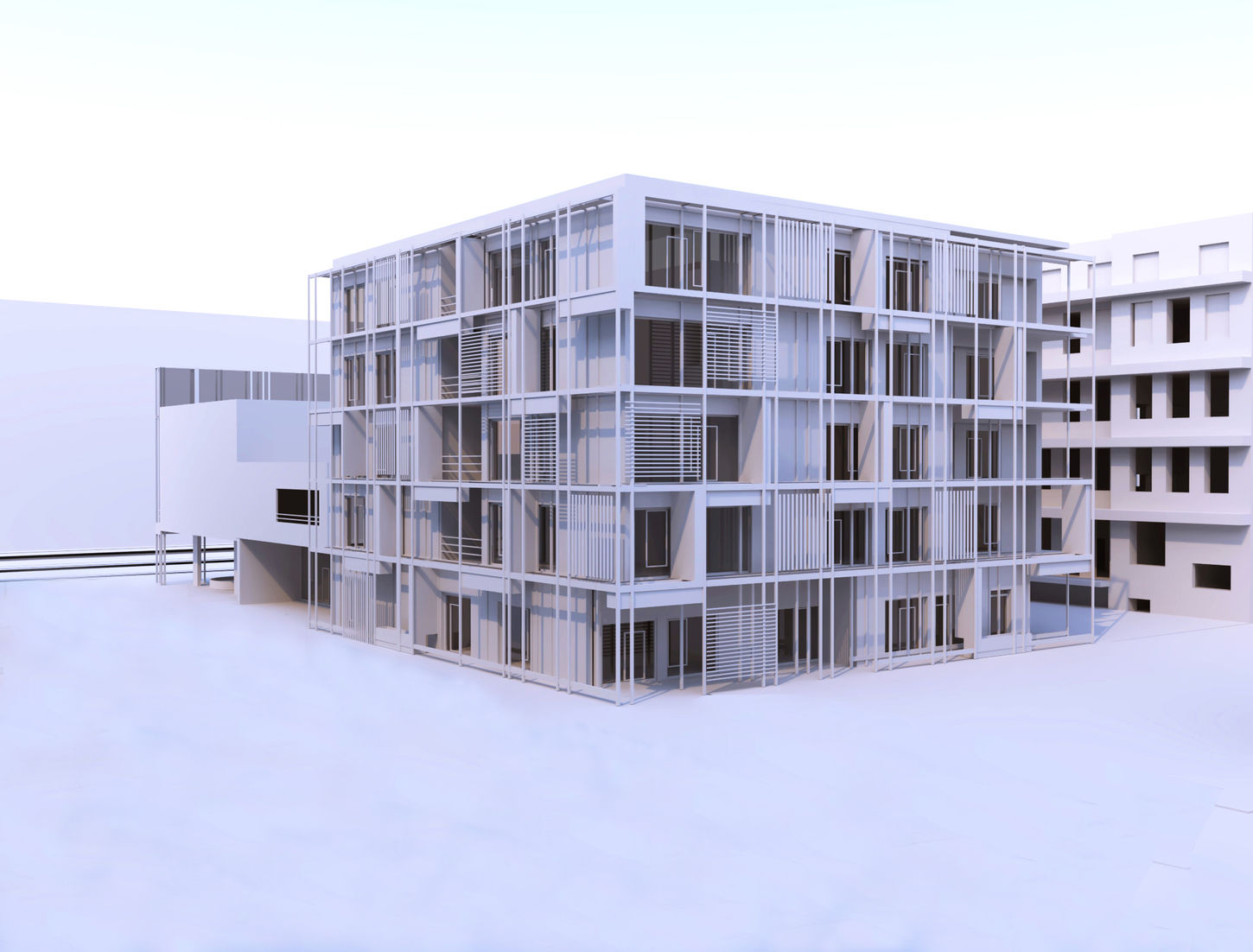 Der neue Baukörper besteht aus dem Cube an der Südostecke des Grundstücks und dem Verbindungsteil der an das Bestandsgebäude andockt. Der Verbindungsbaukörper ist zu zum Teil zweigeschossig womit eine Zäsur zwischen der Turnhalle und dem Cube erzeugt wird. Dieser Einschnitt ermöglicht bessere Belichtung und schafft windgeschützte Freiräume.